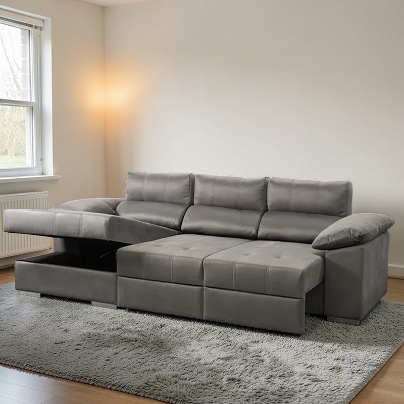 Fabricado em tecido de microfibra de alta qualidade, garante um toque suave, resistência e fácil manutenção. A função sofá-cama torna este modelo extremamente prático, ideal para acomodar hóspedes de forma confortável. Os encostos reclináveis permitem ajustar a posição ideal para relaxar, enquanto a chaise com arrumação integrada oferece espaço extra para manter a sala organizada.