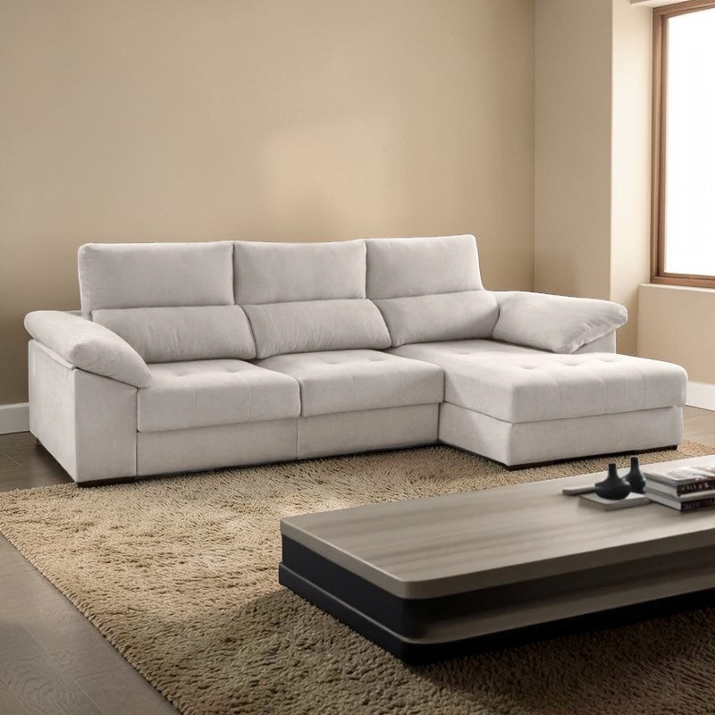 Fabricado em tecido de microfibra de alta qualidade, garante um toque suave, resistência e fácil manutenção. A sua função sofá-cama torna-o uma solução prática para receber visitas, enquanto a chaise com arrumação integrada permite manter a sala organizada, oferecendo espaço extra para guardar mantas, almofadas ou roupa de cama. O seu design elegante alia conforto e praticidade num só modelo.